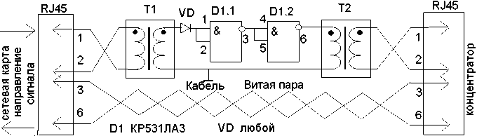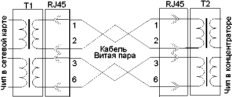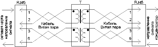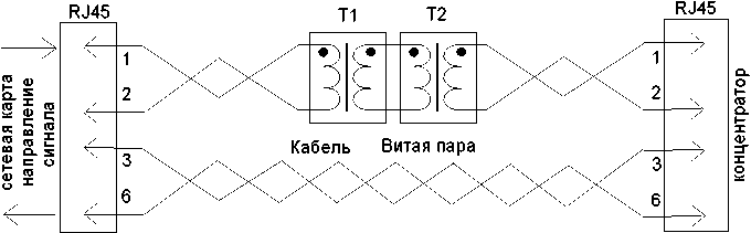 Трансформаторы находятся во всех концентраторах и сетевых картах которые мы видели, в виде интегральных модулей (корпуса DIP или тонкопленочные модули). На рисунке они изображены упрощенно, на самом деле во многих случаях там есть отводы от середины обмотки и внешние элементы, которые эти отводы задействуют. Они (модули) согласуют витую пару с чипом конкретного производителя, выполняют функции фильтра, делают гальваническую развязку.