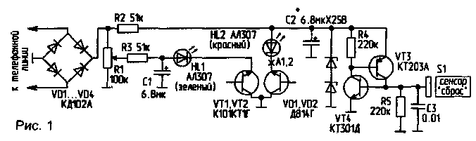 Устройство работает следующим образом. При первом подключении КТЛ к телефонной линии тиристорная "защелка" разомкнута, на генераторы импульсов подается полное напряжение питания (порядка 60 В), оба генератора работают, светодиоды HL1 (зеленый) и HL2 (красный) светятся. После прикосновения к сенсору "Сброс" или нажатия кнопки "Сброс", которую можно подключить параллельно цепочке R5. СЗ. срабатывает и самоблокируется тиристорная защелка (VT3, VT4). Работа генератора на транзисторе VT2 блокируется, устройство переходит в дежурный (рабочий) режим. Потенциометр R1 регулируют такимобразом, чтобы при снятой телефонной трубке(напряжение на линии — около 12 В) генератор на транзисторе VT1 вырабатывал редкие вспышки света. В то же время подключение параллельно нагрузке сопротивления порядка 100..150 кОм должно вызывать срыв генерации. Разумеется, если параллельное подключение высокоомной нагрузки к линии было выполнено раньше, чем был подключен и настроен КТЛ. Устройство сможет отреагировать лишь на подключение еще одной паразитной нагрузки (второго телефонного аппарата, высокоомных наушников, магнитофона и т.п.).