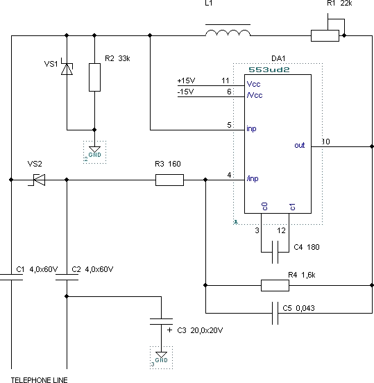 Настройка. Если имеется осциллограф, при включенном питании и подключенной т/ф линии (трубка поднята!) проверяется наличие генерации на выводе 10 DA1 при крайнем левом по схеме положении движка R1.