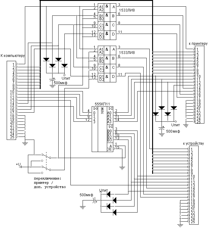 Питание устройства. Поначалу собрал "прототип" разветвителя на двух К155ЛИ1 и одной К555КП11. Питание от одних диодов обеспечивало напряжение около трёх вольт, но уже при такой "раскладке" принтер (матричный CPF-136) спокойно отпечатал пробную страницу. Но при мощных нагрузках дополнительного устройства разветвитель отказывался работать. Раскопав в ящиках материнскую плату от 286-го, подумал: "Чем чёрт не шутит" - и, вытащив оттуда аккумулятор, поставил в качестве дополнительного питания. Теперь вообще no problem - всё работает, как будто никакого разветвителя и нет. Желательно вместо этих серий поставить что-нибудь ещё маломощнее и с более широким разбросом питающих напряжений.