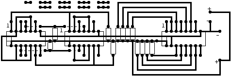 Это вид со стороны монтажа (детали устанавливаются с обратной стороны). Два места с обозначениями "+" и "-" - для конденсатора и аккумулятора. Маркировки, похожие на резисторные - это посадочные места для диодов. Сплошные чёрные линии - дорожки, пунктирные - тоже дорожки, но с другой стороны, их можно заменить обычными проводами. Цифры "1" - рядом с ними должны оказаться первые ножки микросхем при установке. Провода от разъёмов (они у меня закреплены не на самой плате) припаиваются в отверстия на "обрывающихся дорожках" (думаю, Вы поймёте куда, посмотрев на схему).