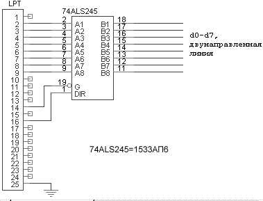 1. Вам необходимо управление малопотребляющим устройством. Описание работы: байт данных ппрограммно выставляется на линии d0-d7, затем защёлкивается регистром ИР22 по импульсу с контакта 14 (AutoFD) LPT. В принципе, можно убрать из схемы регистр - LPT сам фиксирует последний поступивший байт на выходе, но если 1 ножку (ОС) микросхемы через резистор (около 300 Ом) соединить с +напряжения питания, то после выключения компьютера статус линий (включено/выключено) будет сохранён.Можно к выходам Q0-Q7 микросхемы подсоединить транзисторы или тиристоры, тогда можно будет управлять мощными лампами, двигателями и т.д.