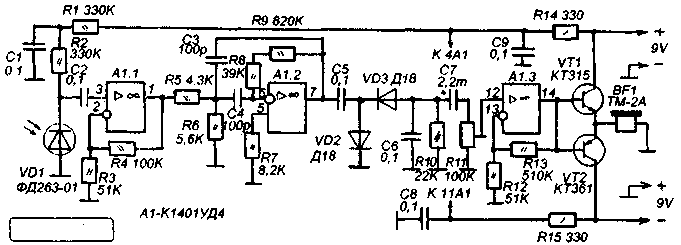 ОУ К1401УД4 не имеет прямой замены среди отечественных микросхем, но вместо А1.1 и А1.2 можно применить любые ОУ с полевыми транзисторами на входе и частотой единичного усиления не менее 2,5 МГц. А1.3 можно заменить на любой ОУ широкого применения. Автор проверял такой вариант : КР574УД2Б и К140УД708. Заметно повысить характеристики приемника можно если применить малошумящие ОУ TLE2074CN и TLE2144CN фирмы Texas Instruments. Цоколевка этих микросхем полностью совпадает с цоколевкой К1401УД4. Светодиод и фотодиод можно взять зарубежного производства для систем ДУ.