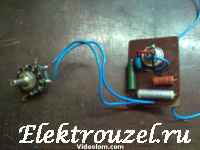 Резистор 510.Оm – ограничивает максимальное напряжение на конденсатор 0,1 mkF, то есть если движок переменного резистора поставить в положение 0.Оm, то сопротивление цепи всё равно будет 510.Оm Справа на схеме резистор на 20 kOm и конденсатор 0.22mkF именуемая RC цепью. RC цепочка, это своеобразная защита симистора от выбросов напряжения при работе на индуктивную нагрузку. То есть если Ваша схема будет регулировать активную нагрузку (лампочка, паяльник, ТЭН и т.д.), то R3 и C можно исключить из схемы, а это делает схему до смешного простой. Итак, конденсатор 0,1mkF заряжается через резисторы 510.Om и переменный резистор 420kOm, после того, как напряжение на конденсаторе достигнет напряжения открывания динистора DB 3, динистор формирует импульс, открывающий симистор, после чего, при проходе синусоиды, симистор закрывается. Частота открывания-закрывания симистора зависит от напряжения на конденсаторе 0.1 mkF, которое, в свою очередь, зависит от сопротивления переменного резистора. Таким образом, прерывая ток (с большой частотой) схема регулирует мощность в нагрузке. Допустим, если подключить электролампу через диод, мы заставим работать её «в полнакала» и продлим её жизнь, однако не получиться регулировать яркость, да и неприятного мерцания не избежать. Этого недостатка нет в симисторных схемах, так как частота переключения сисмистора слишком высока, и увидеть мерцание лампы человеческому глазу не под силу. При работе на индуктивную нагрузку, например электродвигатель, можно услышать своеобразное «пение», это частота с которой симистор подключает нагрузку к цепи. Скажу для тех, кто не знает: электродрели прочий электроинструмент с регулировкой вращения так же использует симисторные схемы. Правда, двигатели в вышеперечисленном коллекторные. Но данная схема была испытана и с асинхронным двигателем 220 V(вытяжка в мастерской) и результат был отличный. Фото работающей схемы: