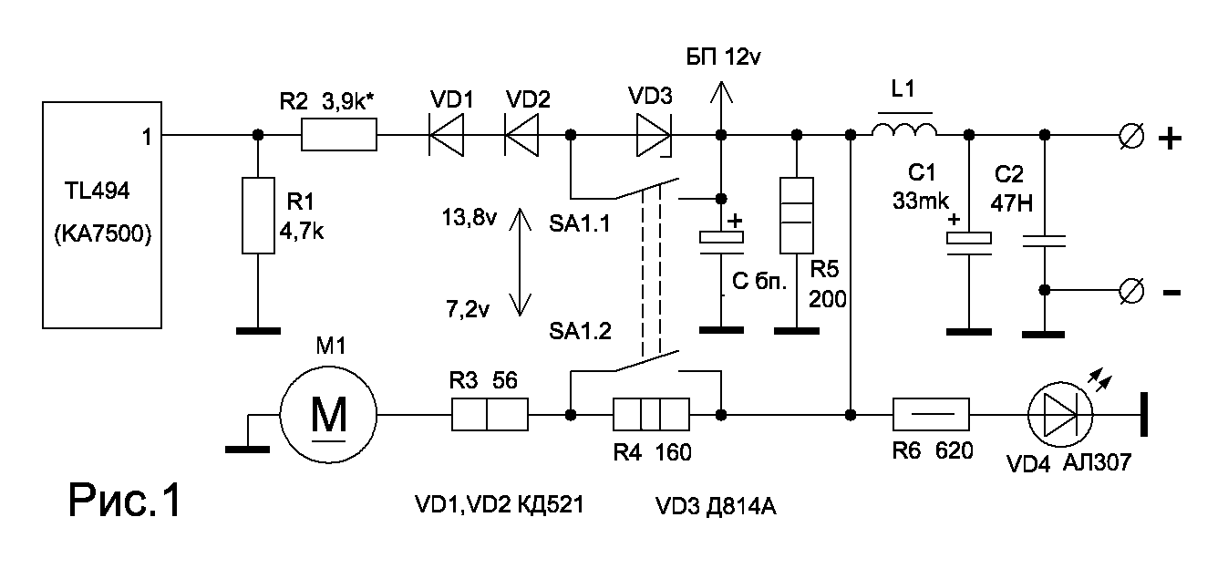 Блоки питания старых ПК можно переделать для питания трансиверов и другой радиоаппаратуры. Для этого можно использовать 12-вольтовый источник, подкорректировав выходное напряжение до нужного. Сделать это можно, подключив первую ножку микросхемы TL494 (KA7500) к источнику 12 вольт через диоды, которые будут определять выходное напряжение. Прежние цепи нужно разорвать (стабилизация была от 5 вольт). Количество и тип диодов подбирают в зависимости от требуемого выходного напряжения. На рис.1 изображен вариант для двух напряжений – 7,2v. и 13,8v. Переключатель напряжения сети БП можно использовать для переключения выходного напряжения. Диоды VD1 и VD2 задают напряжение 7,2v, резистором R2 можно более точно подобрать выходное напряжение. Стабилитрон VD3 задает напряжение 13,8v. Из-за разброса напряжения стабилизации отдельных экземпляров стабилитронов возможно потребуется их подбор до получения нужного напряжения. На выходе БП для устранения помех необходимо включить фильтр L1, C1,C2. L1 намотана на ферритовом кольце 2000НМ, состоит из 5-10 витков провода, идущего к выходной клемме. Если по сети нет фильтров (часто вместо фильтров стоят перемычки), желательно фильтр восстановить. Для индикации выходного напряжения включен светодиод VD4. Чтобы уменьшить шум от вентилятора можно понизить напряжение его питания, подключив последовательно резисторы (R3,R4). При этом вентилятор работает на минимальных оборотах. Однако во избежание перегрева БП при максимальной нагрузке вентилятор должен работать на нормальных оборотах, напряжение питания вентилятора 12v. Переделанный БП обеспечивает ток нагрузки, указанный на блоке для напряжения 12 вольт (этот ток зависит от мощности блока питания). При использовании БП формата АТХ для автономного включения блока необходимо замкнуть на общий провод сигнал PS-ON (14 ножка разьема, обычно это зеленый провод, расположен возле замка разьема). Будут вопросы - обращайтесь