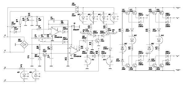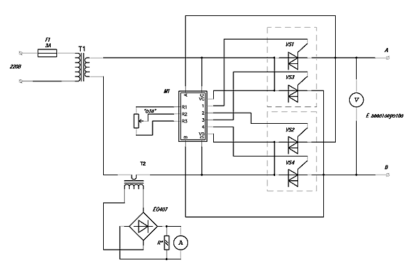 Рис. 1 Схема соединений устройства по силовой части От тока в нагрузке зависит мощность трансформатора Т1 и применяемые симисторы. В данном устройстве применялись ТС112-16. Напряжение на вторичной обмотке трансформатора Т1 около 15В. Диапазон регулировки тока корректируется резисторами R5 (npn задатчике установленным в максимум зарядный ток не должен пропадать), R10(минимaльнoe значение регулируемого тока). Подстроечным резистором R1 устанавливают порог ограничения по напряжению. Размер платы 2,8x3,8 дюйма, способ соединения - пайка в отверстия, которые имеют обозначения А, В, С, D, "1", "2", "3", "4", "VC","VD" и гибкими проводами задатчик -резистор R9 в соответствии со схемой на рис. 1. Рис. 2. Принципиальная схема зарядного устройства Порядок монтажа следующий: