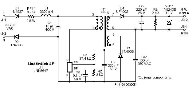 - Схема на рисунке 1 содержит 3 опциональных (необязательных) элемента: RF1, VR1 и C4. Дополнительный предохранитель может быть использован в том случае, если требования по безопасности не позволяют использовать предохранитель - индуктивность. Функция авторестарта ограничивает максимальную выходную мощность в режиме обрыва цепи обратной связи, при этом, если не приемлемо появление напряжения на выходе, необходимо использовать VR1 (0,5W). Y-конденсатор С4 улучшает параметры ЭМИ, но при этом он необязателен для удовлетворения параметров ЭМИ.