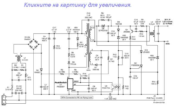 Импульсный источник питания мощностью 32W/81W(пиковая) на микросхеме PKS606 от Power Integrations.