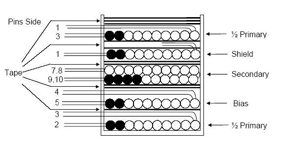 Индуктивность первичной обмотки (выводы 1-2, все остальные обмотки разомкнуты, 100kHz, 0.4VRMS) - 132uH +/-10%