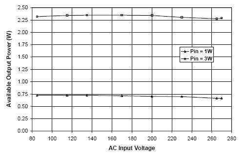 Рис. 8 Доступная выходная мощность на холостом ходу взависимости от входного напряжения (при входном потреблении 1W и 3W).