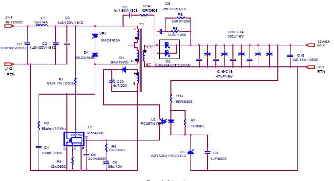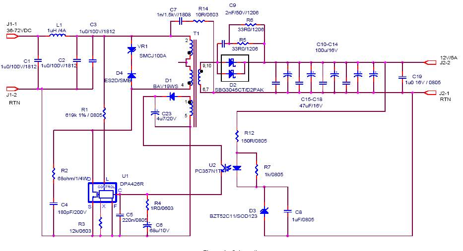 На рис.1 показан одноканальный обратноходовый преобразователь на микросхеме DPA426R. Схема спроектирована для работы с входным напряжением от 36 до 72V и обеспечивает на выходе 12V / 5A. Элементы C1 и L1 - обеспечивают входную фильтрацию. С2 и С3 запасают энергию для передачи ее в нагрузку. Первый пин первичной обмотки трансформатора T1 подключен к высокому выпрямленному напряжению. Другой пин подключен на MOSFET микросхемы DPA426R. Элементы D4 и VR1 - гасят выбросы напряжения на коллекторе, обусловленные индукцией рассеяния первичной обмотки трансформатора.