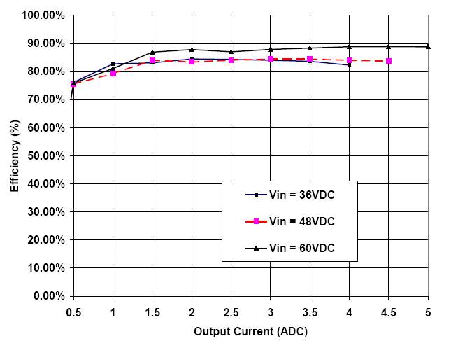1) Зависимость КПД источника питания от выходного тока (при входных напряжениях 36/48/60VDC).