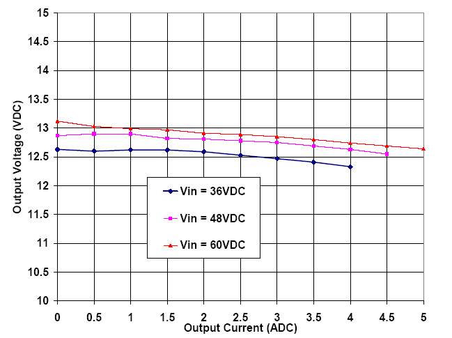 2. Зависимость выходного напряжения источника питания от выходного тока (при входных напряжениях 36/48/60VDC).