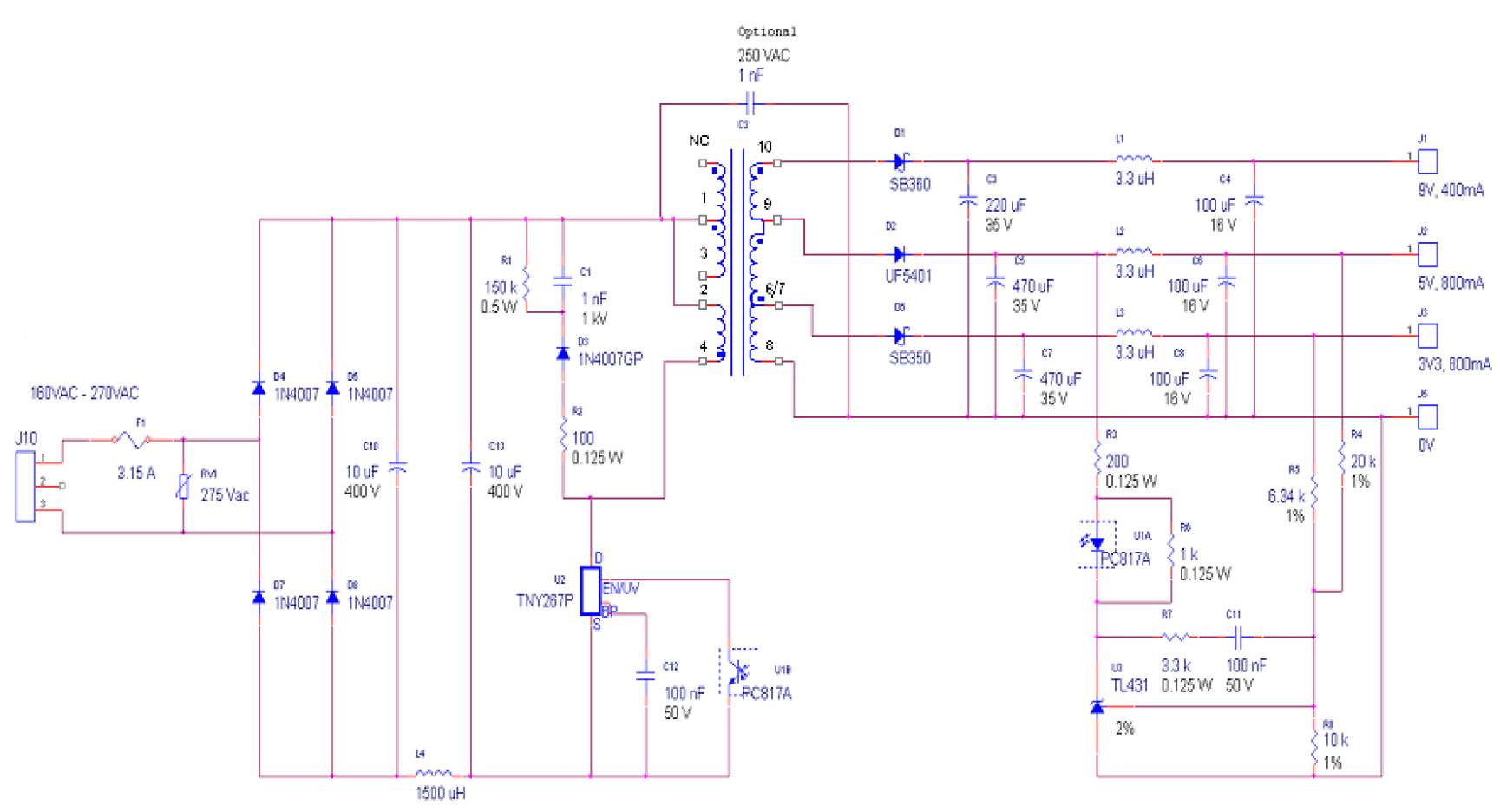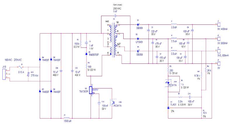 Конденсаторы С10 и С13 совместно с индуктивностью L4 формируют фильтр ЭМИ. Технология частотного джиттера встроенная в микросхемы серии TinySwitch-II позволяет эффективно подавлять ЭМИ даже при использовании очень простого ЭМИ фильтра.