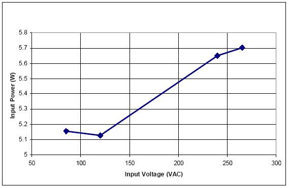 2) Зависимость входной потребляемой мощности от входного напряжения при минимальной нагрузке.