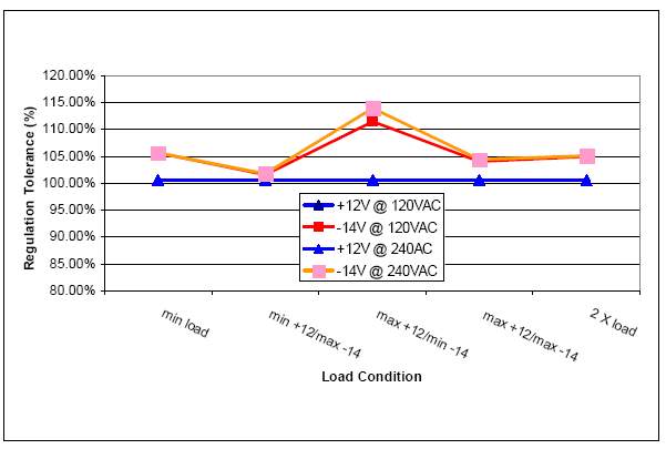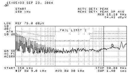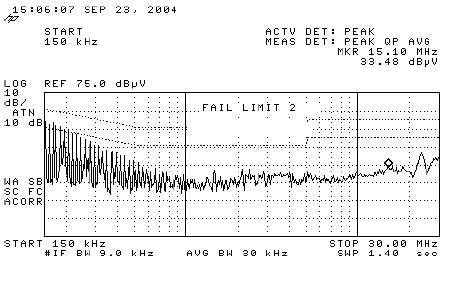 Замеры наведенных ЭМИ прототипа источника питания были осуществлены с целью выяснить эффективность входного фильтра, конструкции трансформатора и правильности разводки печатной платы. Замеры проводились при входном напряжении 115VAC/60Hz с максимальной пиковой нагрузкой приложенной к обоим каналам.