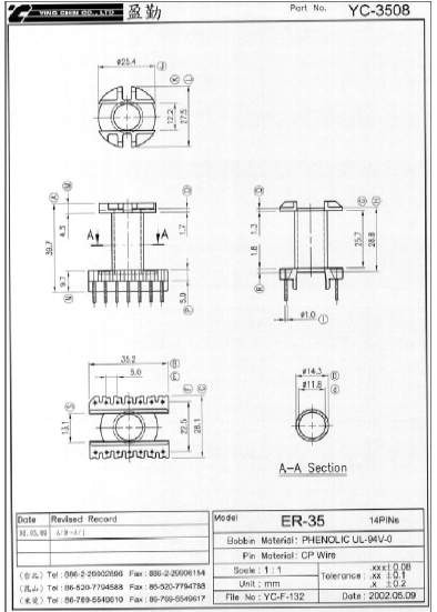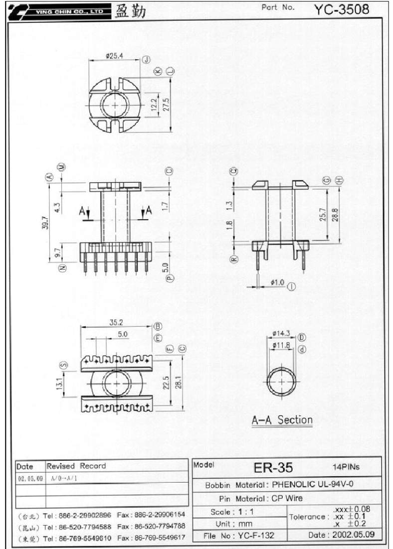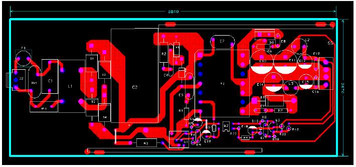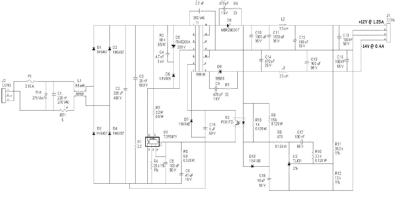 Схема на рисунке выше представляет собой обратноходовый преобразователь на базе микросхемы TOP247Y. Схема спроектирована на диапазон входных напряжений 85-265 VAC и на выходе выдает 2 напряжения: +12V (at) 1.25A и -14V (at) 0.4A.