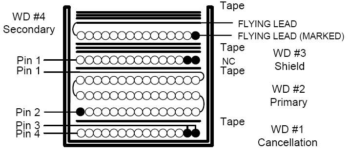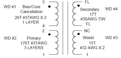 Выходное напряжение источника питания регулируется сигналом с первичной части. Напряжение смещения первичной части выпрямляется и фильтруется элементами D3 и С3. Индукция рассеяния между выходной обмоткой и обмоткой смещения генерирует ошибку в сигнале обратной связи. Используя стандартный выпрямительный диод, есть возможность более четко отслеживать выходное напряжение генерированием напряжения смещения. Резистор R7 подгружает канал смещения, что дает большую точность сигнала обратной связи.
