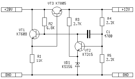 Рис.2. Стабилизатор по классической схеме без защиты от КЗ в нагрузке. 12В, 1А.