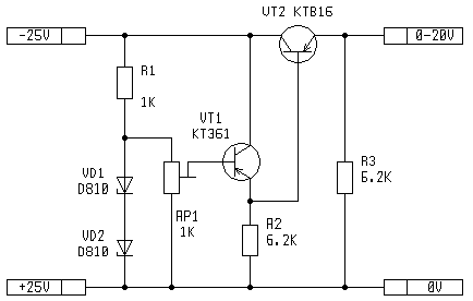 Рис.3. Стабилизатор по классической схеме без защиты от КЗ в нагрузке. Регулируемое напряжение 0..20В, 1А