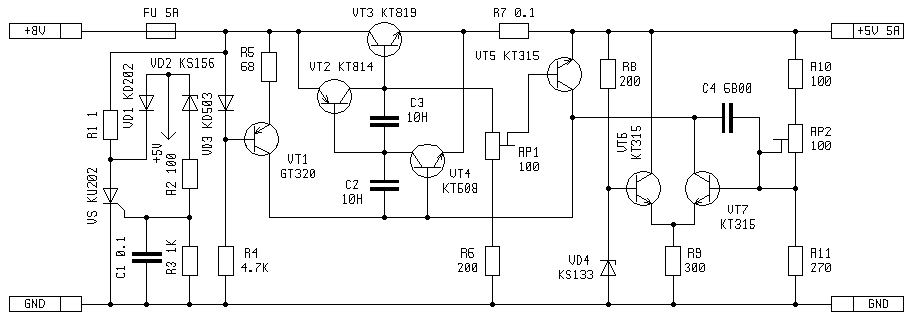 Стабилизатор на 5V 5A построен на основе статьи "Пятивольтовый с системой защиты", Радио №11 за 84г стр. 46-49. Схема действительно оказалась удачной, что не всегда бывает. Легко повторяема. Сделана была не одна. Встречал потом и в промышленных разработках (а