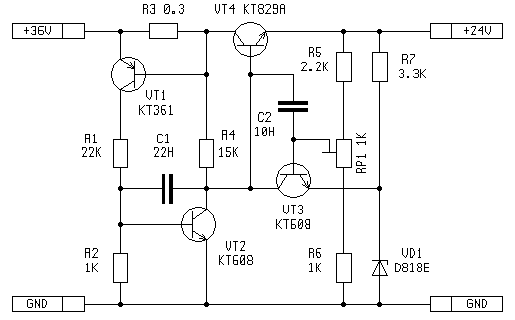 Следующая схема стабилизатора на 24V 2A - это я делал ч/б монитор и пришлось
