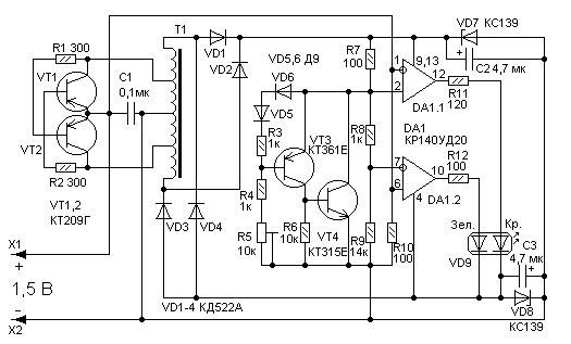 Сразу при подключении испытуемой батарейки к щупам устройства Х1 и Х2 с соблюдением полярности начинает работать генератор на VT1 и VT2. Не знаю точно автора схемы такого преобразователя, но встречается она в публикациях довольно давно, мне впервые встретилась в [3]. Переменное напряжение частотой около 20 кГц выпрямляется диодным мостом VD1-VD4, пульсирующее напряжение фильтруется емкостями С2 и С3, стабитроны ограничивают рост выпрямленного напряжения при малых нагрузках. Таким образром из 1,5 В получаем стандартное двуполярное питание для ОУ относительно общего провода (соединен с "-" проверяемой батареи) порядка +/- 3-3,5 В.