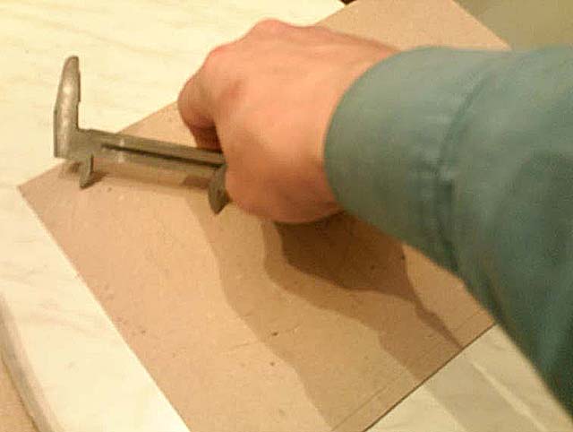 Выставляем штангель на 85мм. и фиксируем винтом. Сам штангель мы будем использовать как циркуль для черчения кругов на картоне. Почему именно штангелем, а не обычным циркулем, которым и проще и удобнее? А все очень просто, когда мы будем острым и прочным концом штангеля чертить по картону, то на картоне останется продавленная борозда и именно она поможет нам. Эта борозда очень полезна для удобства сгибания внутренней рассеченной окружности наших прокладок. В общем, сами поймете, что штангелем лучше, чем удобным циркулем.