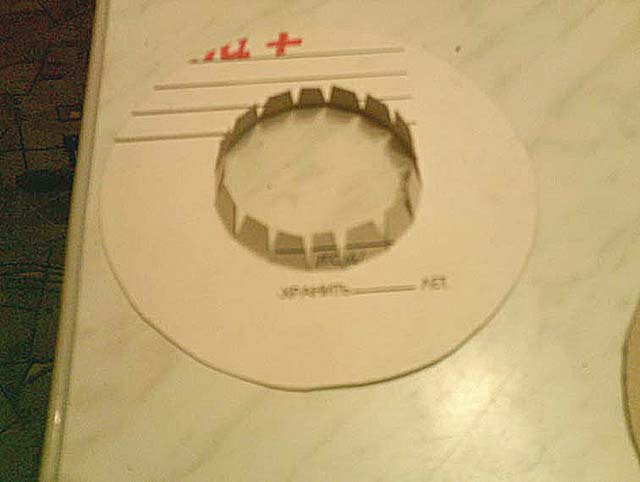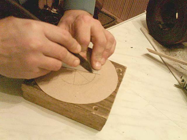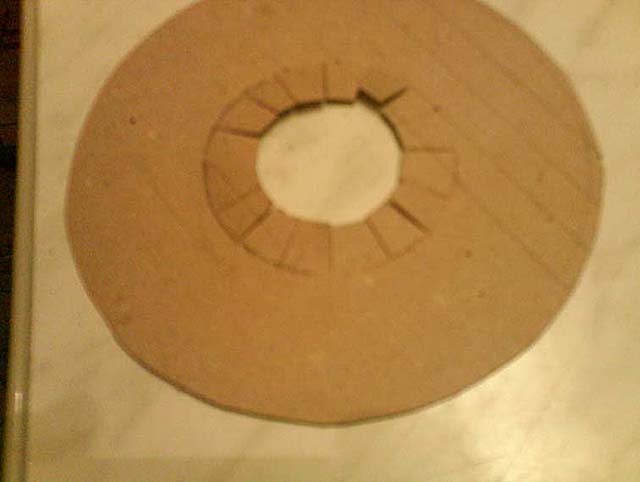 А теперь нам потребуется ровный кусок, фанеры или ДСП на который, мы положим нашу картонную заготовку для прорезания концом острого скальпеля или ножа, нанесенных карандашом наших частей. Прорезать нужно по кругу от внешнего края окружности к центральной точке, не далее иначе картон будет задираться. Прорезать нужно насквозь картона. Далее ножницами вырезаем внутренний круг нарисованный нами обычным циркулем. Полученные дольки отгибаем перпендикулярно заготовки.