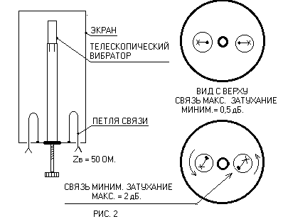 Это позволяет непосредственно заземлить основание без ущерба характеристик вибратора. Такие решения часто используют на практике и относятся к типу цельно металлических конструкций. Согласование фидера с антенной может осуществляться по схеме гамма-образной схеме согласования см. Рис1б. Ползунок на вибраторе обеспечивает согласование с фидером размером "Х", а конденсатор С обеспечивает точную настройку, компенсируя реактивную составляющую петли связи с этим размером. Здесь мы наблюдаем, преобразование открытого вибратора антенны, в вибратор закрытого типа т.е. в узкополосный и экранированный от внешних электромагнитных полей, фильтр. Если в таком резонаторе имеется две петли связи, значит он выполняет функцию полосового фильтра, если одна - режекторного фильтра. Полосовой фильтр выделяет и пропускает заданный спектр частот и работает как параллельный колебательный контур. Режекторный фильтр имеет противоположную задачу, т.е. вырезает заданный спектр частот и работает как последовательный колебательный контур. Полосовой фильтр имеет два типа настройки, это настройка его в резонанс и настойка уровня связи. Режекторный фильтр, как правило, имеет максимальную связь и настраивается только в резонанс. Настройка фильтров в резонанс, заключается в увеличении или уменьшении электрической длины резонатора, методом изменения его физических размеров подобно телескопической антенне, и управляется не сложным резьбовым устройством. Его добротность напрямую связана с чистотой обработки всех элементов, величиной диаметра экрана и пр. На практике принято применять корпуса фильтров диаметром в 5, 8 дюймов. Экран - корпус фильтра может иметь круглое или квадратное сечение. Полоса пропускания полосового фильтра регулируется степенью связи петли с резонатором. Это достигается поворотом обеих петель связи на одинаковый угол вокруг своей оси в одном направлении, см. Рис.2. На фильтрах (банках) заводского изготовления эти углы сопровождаются надписями в виде ожидаемого сквозного затухания в дБ, где минимум затухания составляет 0,5 дБ, а максимум 2,5 дБ. При синхронном повороте петель связи наблюдается простая зависимость: Связь меньше - добротность резонатора выше, полоса пропускания уже, проходное затухание фильтра выше, и наоборот.
