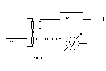 2. РАСЧЕТ ЭНЕРГЕТИКИ ФИЛЬТРА.Необходим для определения характеристик дуплексного фильтра и зависит от характеристик приемника и мощности передатчика в репитере. Мы начнем с определения чувствительности приемника и его характеристик по забитию. Для этого нам понадобится два генератора стандартных сигналов с частотами 144 - 146 МГц. и аттенюаторами от - 20 до - 135 дБ на каждом. Собирается схема согласно Рис. 4.