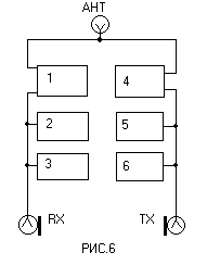 Антенны с вертикальной поляризацией, установленные одна над другой (соосно), имеют развязку около 20 дБ, а если антенны установлены в одной плоскости, т.е. диаграммы направленности их совмещаются в пространстве, этой развязки не будет. Это обстоятельство нужно учитывать при проектировании репитера, что в некоторых случаях сэкономит установку лишней секции фильтра. Мы принимаем решение использования одной общей антенны. Обратимся к характеристикам фильтров диаметром 5 дюймов. Частотная характеристика полосового фильтра изображена на Рис.5а, где при затухании в 0,5 дБ на основной частоте, затухание со смещением в 600 кГц составит всего 7дБ. При уменьшении связи с полосовым фильтром до сквозного затухания в 1 дБ, полоса пропускания немного сузится и затухание со смещением в 600 кГц составит 12 дБ. Понятно, что для построения дуплексного фильтра с затуханием в 72дБ, необходимо составить последовательно 6 полосовых фильтров с общим сквозным затуханием в 6 дБ на приемной стороне. Это было - бы весьма не выгодно, с энергетической и экономической точек зрения, т.к. понадобилось бы еще 6 шт. для установки их на передатчик. Совершенно по иному ведут себя банки в режиме режекторного фильтра. Две банки в режиме режектора, включенные по последовательной схеме, способны подавлять сквозную частоту на 77 дБ см. Рис 5б, что вполне удовлетворяет нашему требованию с запасом в 5 дБ, который можно отнести либо к условному увеличению мощности передатчика, либо к запасу по чувствительности репитерного приемника. Можно придти к выводу, что полосовые фильтры в репитере можно не устанавливать, но это не совсем так. Они необходимы в тех случаях, когда в месте установки репитера присутствует очень сложная электромагнитная обстановка. Дело в том, что мощные и близко расположенные, в частотном и пространственном аспектах, радиопередатчики, образуют на входе репитерного приемника комбинационные составляющие - помехи. Часто такой же полосовой фильтр необходимо устанавливать на выходе передатчика исходя из тех же соображений. Схема дуплексного фильтра используемого на репитере RR9LA изображена на Рис.6. Кабели, соединяющие между собой банки, а также кабели идущие от банок к антенному тройнику должны иметь электрическую длину = лямбда/4. Полосовой фильтр 1 и режекторные фильтры 5 и 6 настроены на частоту приема 145,000 МГц. Режекторные фильтры 2, 3 и полосовой фильтр 4, настроены на частоту передачи 145,600 МГц. Следует отметить, что полосовой фильтр легко переделать в режекторный, для этого достаточно ко второй петле связи подключить поглощающее сопротивление 50 Ом, что делают чаще всего в цепи передатчика для облегчения режима работы его выходного каскада, или заглушить отверстие для одной петли связи металлической шайбой.