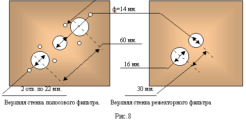 4. ИЗГОТОВЛЕНИЕ ФИЛЬТРА КУСТАРНЫМ СПОСОБОМ.Прежде, чем приступить к изготовлению дуплексного фильтра, необходимо знать схему его конструкции, т.е. провести работы по предварительным расчетам. Предположительно мы приняли схему, изображенную на Рис. 6. Корпуса фирменных профессиональных фильтров для диапазона 136-174 МГц изготавливают из мягкого аллюминия, а резонаторы и петли связи из латуни с повышенным количеством меди. В радиолюбительской практике изготовление каких либо конструктивов в заводском исполнении на 100% мало вероятно. Здесь предлагаются методы изготовления высокодобротных фильтров не уступающих фирменным на данный диапазон. Прежде всего, это изготовление корпуса не из алюминия, а из меди. Для экономии материалов, корпус изготовим общим для всех фильтров, а в качестве материала используем двухсторонний фольгированный стеклотекстолит. Всего понадобится 1,75 кв.м. фольгированного стеклотекстолита толщиной 3 мм. Размеры, раскрой и деталировка изображены на Рис. 7;8. Петлю связи и резонатор желательно изготовить из меди в крайнем случае из латуни. Изготовление каких либо элементов фильтра из бронзы, нержавеющей стали и т.п. не реомендуется ввиду резкого снижения его добротности и как следствие того, напрасная трата времени и средств. Размеры и конструктив резонатора, изображенного на Рис. 9 и могут быть изменены, главное, чтобы соблюдалось основное правило,что заземленный четвертьволновой штырь имел максимальную добротность при возможности перестройки последнего. Все детали фильтра, а главное резонатора желательно отполировать, а перед установкой обезжирить. Поскольку фольгированный стеклотекстолит имеет удовлетворительную чистоту обработки и достаточно тонкие стенки, его полировать не нужно. КОРПУС ДУПЛЕКСНОГО ФИЛЬТРА