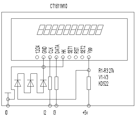 При использовании индикатора ЖКИ , микросхемы D1,D3 и резисторы R1-R7 можно не устанавливать . Индикатор ЖКИ подключается к контактам I2 , I3 блока . Для идентификации этого типа индикации , нужно установить перемычку с вывода I0 блока на корпус .