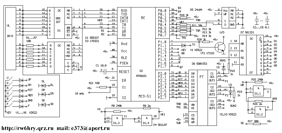 Клавиатура состоит из 6-ти кнопок . Удобно использовать малогабаритные кнопки , применяемые в импорных телевизорах для настройки . Они стоят недорого , занимают мало места и довольно надежны . Для кнопок изготавливается печатная плата примерно 22х32 мм из одностороннего текстолита толщиной 1 мм , на которой печатным способом или просто резаком делаются посадочные места для кнопок .Полученная плата приклеивается с левой стороны от индикатора . Диоды V1-V6 на клавиатуре можно не устанавливать . В этом случае следует помнить о том , что нельзя одновременно нажимать две кнопки , это вызовет неправильную установку частоты . На микросхеме D5 - 24с04 выполнена энергонезависимая память . На микросхеме D6 - 580ВИ53 выполнены ДПКД , которые заменяют ДПКД1 и ДПКД2 синтезатора радиостанции . Микропроцессор непосредственно управляет этими ДПКД , устанавливая таким образом рабочую частоту радиостанции . На микросхеме D7 выполнен дешифратор ГУН1 . Сигналы с дешифратора включают требуемый ГУН , в зависимости от рабочей частоты . На микросхеме D4 выполнен формирователь сигналов валкодера . Фотодиоды валкодера DL,DR и светодиод SD подключаются к соответствующим выводам блока . На транзисторе VT1 выполнен узел управления переключением боковой полосы . Когда транзистор открыт , установлена верхняя боковая полоса . Выход U/D нужно подавать на вход транзисторного каскада , управляющего реле , которое переключает ЭМФ или опорные гетеродины . Блок управляется с клавиатуры и от валкодера . При нажатии кнопок выполняются следующие функции .