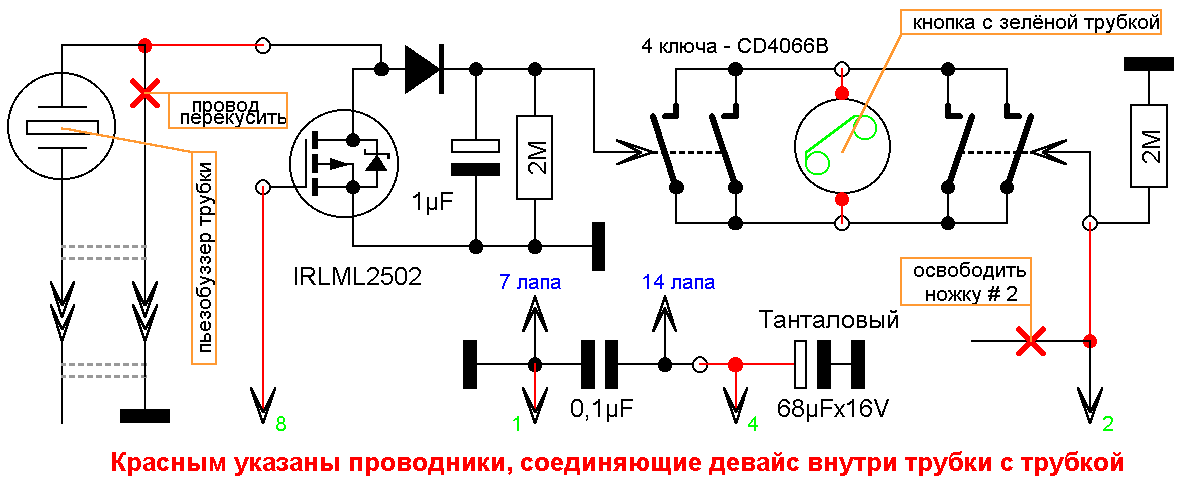 Для наглядности приведу несколько рисунков, поясняющих, что и куда паять внутри сотовой трубы: