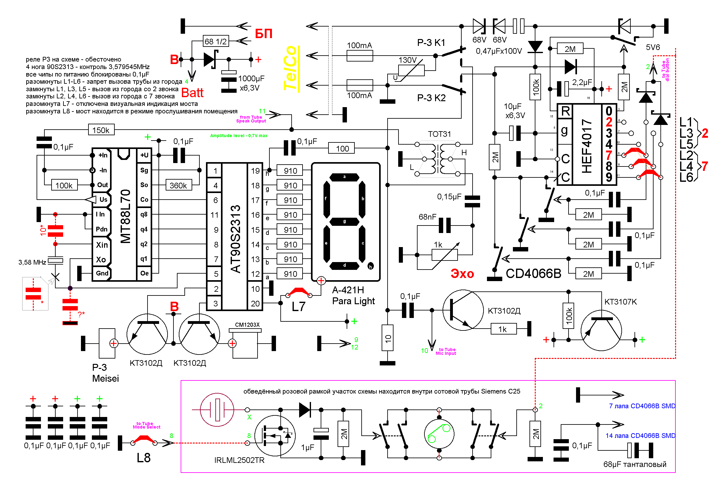 Счётчик звонков из ГАТС, автомат сброса в исходное состояние по окончании звонков и формирователь сигналов управления для дозвона моста к хозяину при входящих из города на мост звонках реализованы на HEF4017 (кривой отечественный аналог – К561ИЕ8, применять настоятельно не рекомендую) и HEF4066B (прямой отечественный аналог – К561КТ3, или вражеский CD4066B) с обвязкой. Автомат запускает дозвон к хозяину сотового моста со 2-го или 7-го звонка из города, формируя на выводе #2 дата-порта переделанной трубки 2 коротких импульса. Эти импульсы производят «нажатие» зелёной кнопки, запуская трубу в режим звонка хозяину моста. Имеется возможность отключить на мосте входящие из города звонки, если со счётчика звонков и формирователя управления трубой сняв все перемычки с мостиков L1-L6. Мостик L8 – технологический. Он должен быть всегда замкнут перемычкой. Если снять перемычку L8, входы-выходы звука и автоответ «своему» абоненту будут отключены, то есть труба будет отключена от моста.