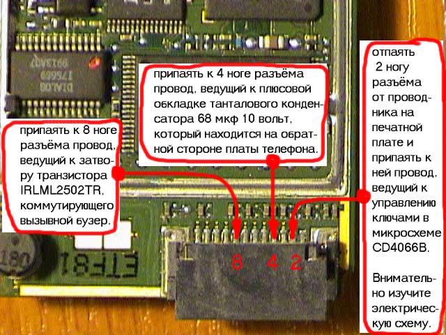 После этой переделки при установленной на мост трубке на 8 ноге дата-порта будет «0», что приведёт к закрытию ключа IRLML2502. В таком случае цепь пьезобуззер + диод внутри IRLML2502 + диод + 2M резистор + 1мкФ конденсатор образуют обыкновенный амплитудный детектор, управляющий парой ключей HEF4066B, которые управляют кнопкой ответа на входящий звонок. Учитывая, что при звонках не из VIP списка будет молчание, амплитудный детектор ничего не обнаружит и не даст добро на ответ трубки. Если же поступит звонок из VIP-списка телефона (до 9 абонентов, программируется хозяином сотового моста), то детектор установит на управляющих входах HEF4066B логическую «1», кнопка с зелёной трубкой будет «нажата» и произойдёт мгновенный автоматический ответ на вызов. Перед поднятием трубы пьезобуззер однократно коротко пропищит. Так построен автоподъём трубки «для своих» при вызове моста из сотовой сети. Когда сотовая трубка находится вне моста, она работает, как обычно – IRLML2502 открыт управляющим напряжением около 1,8V, что приходит с 8 ноги дата-порта. Пьезобуззер через переход сток-исток IRLML2502 «жёстко» подключен к массе телефона – амплитудный детектор автоответа заблокирован.