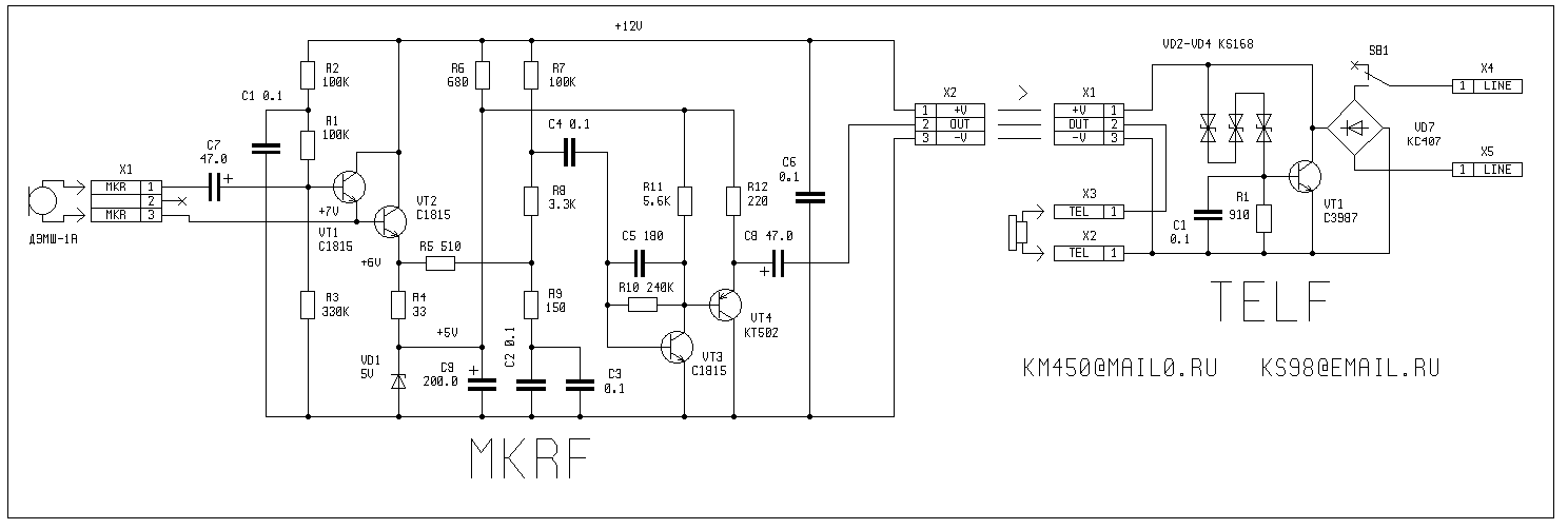 Была у меня трубка от какого-то нашего советского модема который за ненадобностью был разбазарен. В трубке маленькая схемка была, видимо к микрофону в качестве которого применен был ДЭМШ-1А и обычный телефонный капсюль с сопротивлением обмотки 100 ом. Валялась лет десять наверно, выкинуть жалко, но и не нужна вроде. А тут вот года четыре назад в очередной еще раз женился а ей, (жене, не трубке конечно) бывает звонят в ну самый не подходящий момент (!), и приходится вставать (с дивана) и идти к телефону, чтобы потом ее же и звать к примеру. Еще один телефон ставить накладно, да и модему мешают. И тут думаю - сделать надо телефон без номеронабирателя и звонка и делов то. Звонят к примеру в час ночи, руку под подушку, трубку взял, тумблером щелк и не вставая с места (послал всех на ...) объяснил что сейчас занят. Полюбопытствовал на сайтах tacxema.boom.ru и alltlf.narod.ru как электронные телефонные аппараты внутри выглядят. Так и родилась эта схема. Схема собрана на двух маленьких платах. Одна с усилителями микрофона и телефона расположена под микрофоном, другая, на которой собран узел защиты от сигнала вызова (а это примерно 80-120 вольт) и движковый выключатель для ответа и отключения после окончания разговора под телефонным капсюлем. Детали использованы с дохлых плат принтеров, мониторов, источников питания персоналок и т.д. Транзисторы С1815 - запросто меняются на наши КТ315. С3987 - мощный составной транзистор с большим коэффициентом усиления, что-то около 10000-15000. Но думаю подойдет и обычный мощный, например КТ815. Его задача всего лишь срезать напряжение звонка до 20 вольт чтобы схеме дурно не было и все. Стабилитрон VD1 имеет напряжение стабилизации 5 вольт, импортный, поэтому и маленький. Из-за малых размеров соответственно и детали подобраны. Резисторы например от дохлых мышей я использовал, аналог наш МЛТ-0,05 будет. Подойдут по размеру и мощностью 0.12 вт, если их поставить вертикально. Разъемы малогабаритные любые, я использовал например от дохлых мышек. Напряжения на схеме указаны при "снятой" трубке. Рис.1. Принципиальная схема трубки - (щелкните мышью для получения большого изображения) К рисункам печатных плат добавлю следующее: