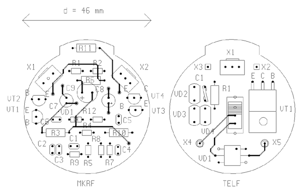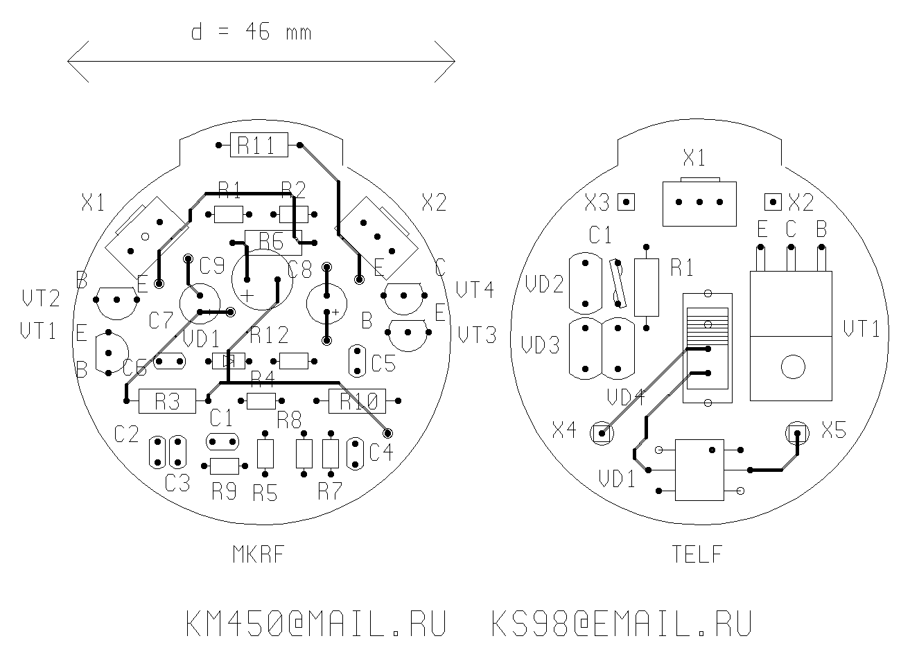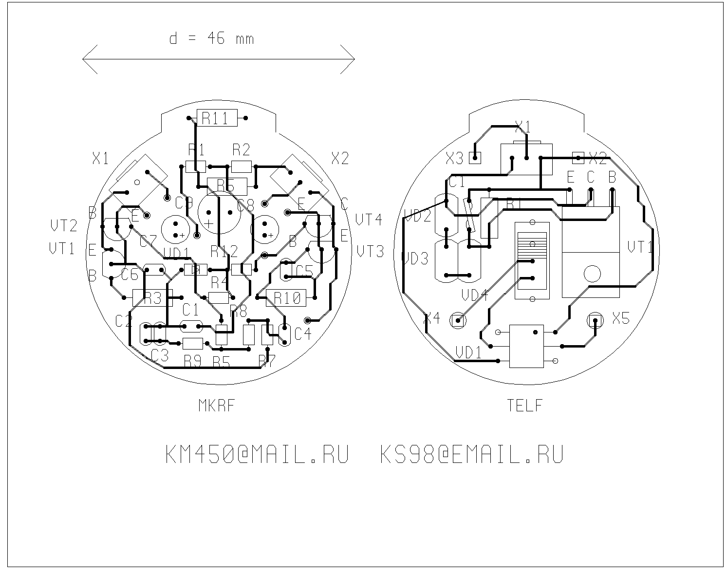 деталей (щелкните мышью для получения большого изображения) Рис.3. печатная плата с обратной стороны - не зеркальная т.е. как бы прозрачная. (щелкните мышью для получения большого изображения) Трубки раньше были как правило одинаковые так как применялись стандартный угольный микрофон и телефонный капсюль. Думаю эти платы могут и подойти по размеру. Если нет тогда уж как нибудь самому разводить. |