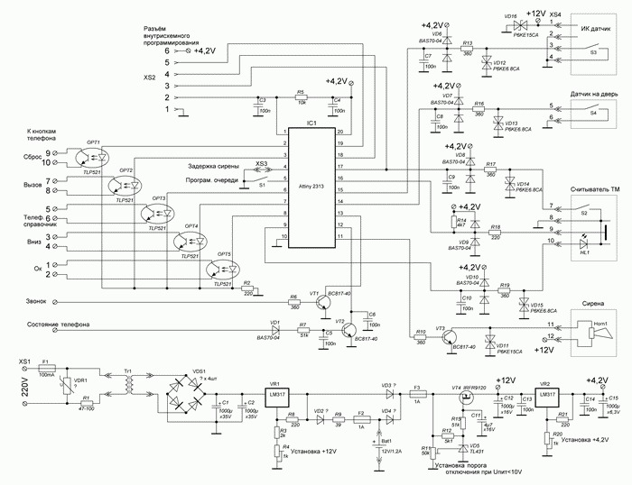 - Подключить по рисунку в конце описания все датчики и сирену.