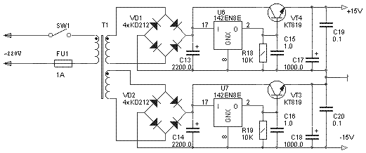 Как видно из схемы, это классическая схема двуполярного стабилизатора, правда значительно умощненного. Это сделано для случая использования прибора в больших помещениях, когда требуется значительная мощность. ИМС стабилизаторов в охлаждении не нуждаются, а VT4 и VT3 охлаждать все же придется.