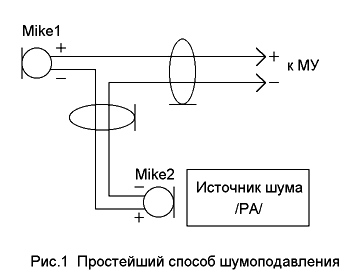Акустические шумы сопровождают радиолюбителя на протяжении всех его занятий радио. Проблема усугубляется, если в составе радиостанции имеются устройства, производящие шум, например: компьютер, усилитель мощности со встроенным вентилятором. Сюда можно добавить расположенные рядом бытовые приборы: телевизор, холодильник, вентилятор, обдувающий собственно самого оператора в зонах с жарким климатом, а также пребывание рядом других людей, создающих дополнительную шумовую нагрузку. Все это приводит к тому, что передача оператора сопровождается локальным шумом, снижающим разборчивость передающего сигнала. Негативный фактор этого явления проявляется еще больше, когда применяется компрессия или ограничение. Чем выше уровень обработки сигнала, тем больше слышны шумы в канале. Иногда проблема успешно решается с применением антишумовой гарнитуры ГСШ-А-18, предназначенной для работы в условиях акустических шумов. Однако, характеристики настольного микрофона, как правило, будут выше, чем у гарнитуры даже такого высокого класса [1], поэтому многие используют настольные или даже студийные микрофоны. Несколько снизить шумы в канале передачи можно, включив в противофазе два динамических микрофона, соединив положительный вывод одного из них с отрицательным выводом другого (рис.1).