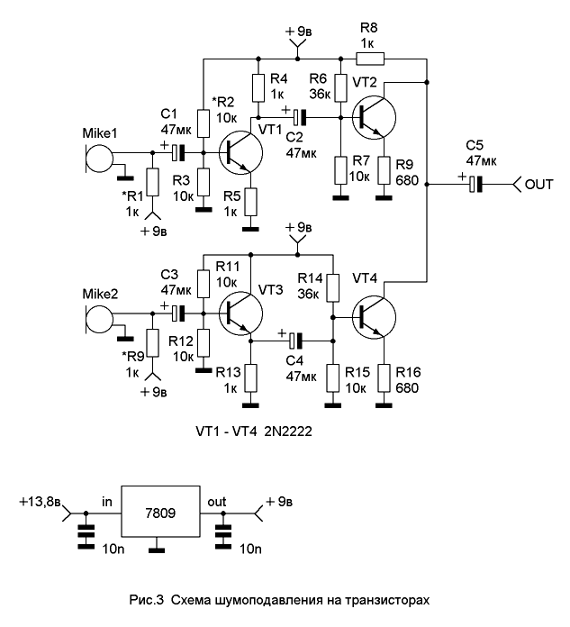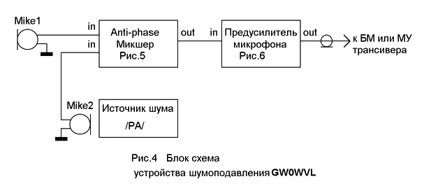 Транзисторы VT1 и VT3 обеспечивают фазовый сдвиг, необходимый для подавления локальных шумов. VT2 и VT4 работают как буферные усилители. Далее сигнал идет к трансиверу. Резистор R2 подбирают или устанавливают вместо него потенциометр 22 к. Подстройка этого элемента также способствует максимальному подавлению постороннего шума в канале. Транзисторы желательно использовать те, что показаны на схеме. Они не являются дефицитными, хотя можно применить КТ315, КТ317, но лучше все же применить 2N2222. Не стоит применять КТ3102. Для них нужен свой режим и те компоненты, показанные на схеме не соответствуют их режимам по постоянному току. На рисунке показан стабилизатор +9в собранный 7809 (LM7809, IC7809) которым питают МУ и электретные микрофоны. Более совершенное устройство шумоподавления с использованием современного ОУ NE5534 предложил Mark, GW0WVL при личной переписке. Блок схема устройства показана на рис.4.