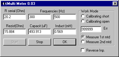В левых верхних окнах пользователем задаются значения генерируемых для измерения частот и сопротивление установленного дополнительного резистора R serial. Эти параметры могут быть разными для различных режимов и величин измерений, что будет уточнено ниже. В левых нижних окнах выводятся числовые значения для измеряемых величин: сопротивление (Ом), емкость (микрофарад), индуктивность (миллигенри). Теоретически каждый электрический элемент может обладать заметными величинами одновременно сопротивления, емкости и индуктивности, что и будет отображаться во всех трех окнах программы. Однако действительным будет только то значение, которое соответствует роду измеряемой величины. Значения частот Multi Meter могут лежать в интервале 50:1000 Гц. При измерении сопротивления обычного резистора подбор частоты не так важен. Обе частоты применяются в режиме Автор программы дает следующие рекомендации по подбору сопротивления R serial и частот сигнала (Yamaha 724) для Multi Meter v.0.03: • При измерении емкости конденсаторов номиналом 0,22мкф и выше рекомендуется R serial 20 Ом и частоты 100/1000 Гц. Для измерения конденсаторов меньших номиналов рекомендуется увеличивать частоты и сопротивление R serial, но не более чем 1000 Ом. • Для измерения резисторов номиналом от 1 Ом до 10 кОм рекомендуется R serial 20 Ом, частоты не оговариваются. Насчет измерения индуктивности никаких рекомендаций нет. • Уровень сигнала на линейном входе и выходе в микшере Windows рекомендуется поставить на середину, но не выше 3/4. Хотя может оказаться, что эти уровни нуждаются в более скрупулезной настройке. Я со своей стороны провел всесторонние практические испытания Multi Meter 0.03, перемерив огромное количество радиоэлементов. На основе собственного опыта были определены оптимальные значения R serial и наборы частот для тех или иных режимов и диапазонов. Так же на практике были установлены возможности Multi Meter в связке с саундкартой Yamaha 724 производства Genius. Определялись диапазоны значений, в которых программа еще могла нормально работать, а так же погрешности измерений. При этом для соединения использовались не экранированные провода длиной около 80 см с зажимами типа <крокодил> на концах. Уровни микшера Line-Out, Line-In были выставлены на 50%. Начнем с резисторов. Измерения проводились в режиме Емкость конденсаторов с помощью Multi Meter удавалось измерять в диапазоне от 1 нф до 1000 мкф независимо от типа. Режим программы - Индуктивность дросселей мне удавалось довольно точно измерять в диапазоне от 4 мкГн до 120мГн (выше просто не было чего измерять). Опять же не было точного прибора, с помощью которого можно было бы сравнивать показания. Для тех трех десятков дросселей, что были у меня, я думаю, максимальная погрешность была не хуже 5%. При этом был установлен R serial 20 Ом и частоты 700/1000. При индуктивности ниже 4 мкГн Multi Meter давал сначала заниженные показания, а потом и вовсе нули. Нижний предел можно еще попробовать опустить где-то до 2 мкГн, установив частоты 900/1000, однако здесь падает общая стабильность. Недостатком Multi Meter является зависимость результатов измерений от уровней Line-Out, Line-In сигнала. Сказываются слишком завышенные или заниженные уровни. Надо учитывать, что у разных звуковых карт уровни могут существенно отличаться. Предусмотренная в программе калибровка по короткозамкнутой и разомкнутой измерительной цепи в этом случа
