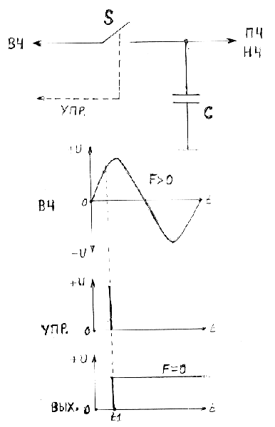 Рис.1 На рис.1 вверху изображена схема устройства выборки - хранения (УВХ) мгновенного значения входного сигнала,которое в радиотехнике выполняет функцию смесителя.Рисунок внизу раскрывает физическую суть процесса преобразования частоты сигнала - это одноразовый акт поглощения импульса энергии и его хранения.