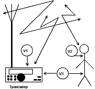 В зависимости отношения размеров этих предметов к длине волны, от поверхностной проводимости для высокочастотных токов этих предметов, от расположения предметов относительно антенны будет зависеть величина высокочастотного напряжения, которое будет на этих предметах при работе антенны на передачу. Человек- оператор радиостанции, его трансивер являются для антенны посторонними предметами. Исходя из этого, можно предположить, что при работе радиолюбительского передатчика, будут происходить неизбежные наводки высокочастотной энергии на корпус передатчика, на человека-оператора радиостанции, и на близлежащие около трансивера предметы, как это показано на рис. 1.