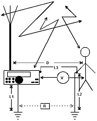 К сожалению невозможно уравнять высокочастотные потенциалы передатчика и человека путем использования индивидуального заземления каждого из них на общую “землю” как это показано на рис. 3. Такое возможно только в электротехнике, где работают с электрическим напряжением промышленной частоты 50 Гц. На высоких частотах дело обстоит несколько иначе. Вследствие конечностей длины провода системы заземления L1 и L2 от трансивера и оператора до радиотехнической земли, наличия конечного расстояния D между трансивером и человеком, наличия некоторого определенного сопротивления R между системами заземления человека и трансивера, всегда между телом человека и трансивером будет некоторое высокочастотное напряжение V. При достаточно высоком уровне это высокочастотное напряжение будет вызывать “жжение” тела человека при соприкосновении его с корпусом передатчика.