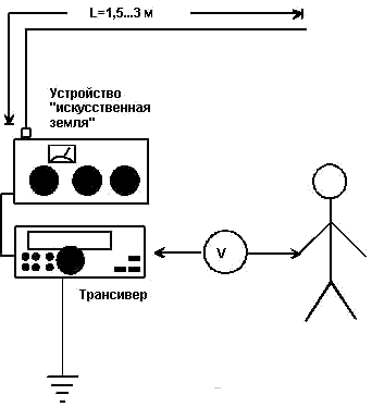 При подключении к корпусу трансивера устройства “искусственная земля” в паразитной антенной системе, в которую входит корпус трансивера, и подключенное к нему окружение, с помощью устройства “искусственная земля” можно изменить ее параметры. Путем соответствующей настройки устройства “искусственная земля” можно обеспечить максимальный отсос высокочастотного тока в подключенный к нему противовес, в результате чего произойдет снижение высокочастотного напряжения на корпусе трансивера.