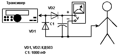 Далее этот провод подключают к устройству типа “искусственная земля”, а устройство “искусственная земля” максимально коротким проводником к трансиверу. Схему устройства “искусственная земля” можно взять из [1]. Первоначально в устройстве “искусственная земля” индуктивность переменной катушки устанавливают на “0”, а емкость переменного конденсатора устройства “искусственная земля” устанавливают на максимум. Включают трансивер в режим “передача” на одном из “жгучих” диапазонов. Регулируя последовательно индуктивность и емкость элементов настройки устройства “искусственная земля”, добиваются минимального высокочастотного напряжения между корпусом трансивера и телом оператора. Конечно, минимум высокочастотного напряжения можно определить по отсутствию “горячего” соприкосновения между телом оператора и корпусом трансивера. Но удобнее и безопаснее для человека использовать для этих целей высокочастотный вольтметр, который включают между телом человека и корпусом трансивера, как это показано на рис. 5. Высокочастотный вольтметр должен быть малогабаритный с батарейным питанием, проводники между вольтметром, трансивером и телом человека должны быть минимальной длины. В случае отсутствия в лаборатории радиолюбителя малогабаритного высокочастотного вольтметра можно использовать обычный малогабаритный вольтметр для измерения постоянного напряжения снабженный самодельным высокочастотным пробником. Схема такого устройства показана на рис. 6. Желательно использовать вольтметр с цифровой индикацией.